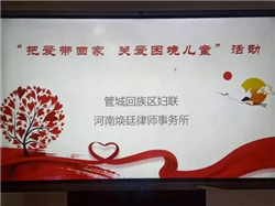 寒假將至,為使廣大兒童度過一個安全、文明、祥和、溫暖的假期,在全社會營造關愛困境兒童的良好氛圍,中華全國婦女聯合會號召多關愛困境兒童,“把愛帶回家,關愛困境兒童”。2020年1月15日,管城回族區婦聯響應全國婦聯號召,在鄭汴路社區舉行“把愛帶回家關愛困境兒童”關愛活動,煥廷法律服務集團劉煥廷主任受邀參加此次活動,為困境兒童辦實事、送溫暖、獻愛心。