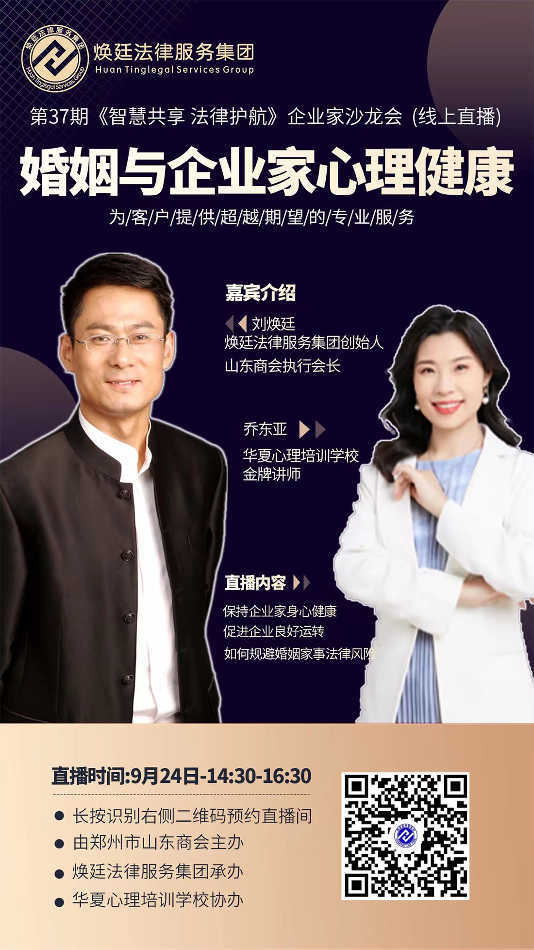 如何規避婚姻家事法律風險,保持企業家身心健康,促進企業良好運轉?歡迎參加煥廷律師事務所第三十七期《智慧共享 法律護航》企業家沙龍會。本次沙龍會采用線上直播的形式,將于2022年9月24日下午14:30于煥廷法律服務團隊微信官方賬號如期開播(微信視頻號搜索“河南煥廷律師事務所”,關注后即可觀看)。