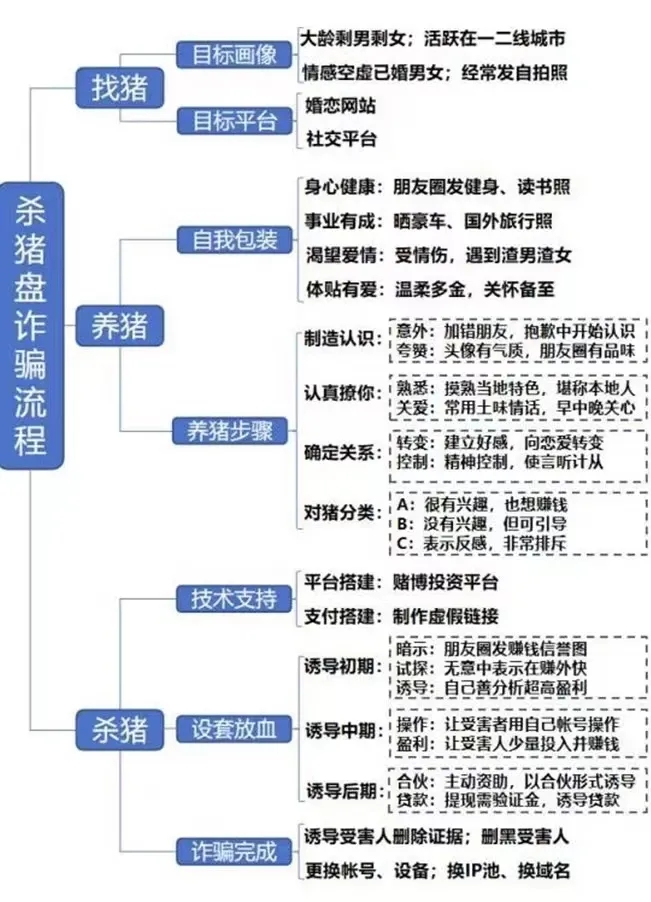 記者了解到,詐騙分子把受害人叫“豬”,把交友工具(App及婚戀網(wǎng)站)叫“豬槽”,把聊天劇本叫“豬飼料”,把戀愛叫“養(yǎng)豬”,把詐騙錢財叫“殺豬”,這就是“殺豬盤”。一般來說,殺豬盤詐騙比其他通訊網(wǎng)絡(luò)詐騙(如網(wǎng)絡(luò)兼職刷單、網(wǎng)絡(luò)貸款、冒充公檢法等)的過程長,更難識別。它往往披著愛情的外衣,騙子以高富帥(白富美)的形象出現(xiàn),編造故事、虛構(gòu)現(xiàn)實,使受害人慢慢步入騙局。