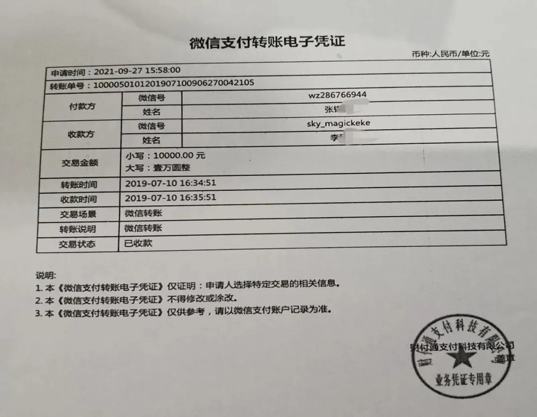 經反復嘗試,張某通過微信賬號綁定的實名認證的手機號碼,證明了自己確系借款方微信號的持有人。并通過微信賬單“申請轉賬電子憑證”功能,得到了一張顯示有原、被告完整姓名的憑證。